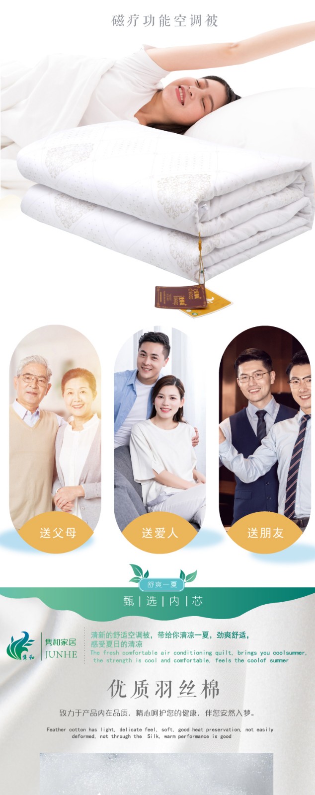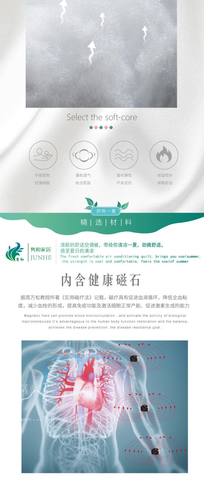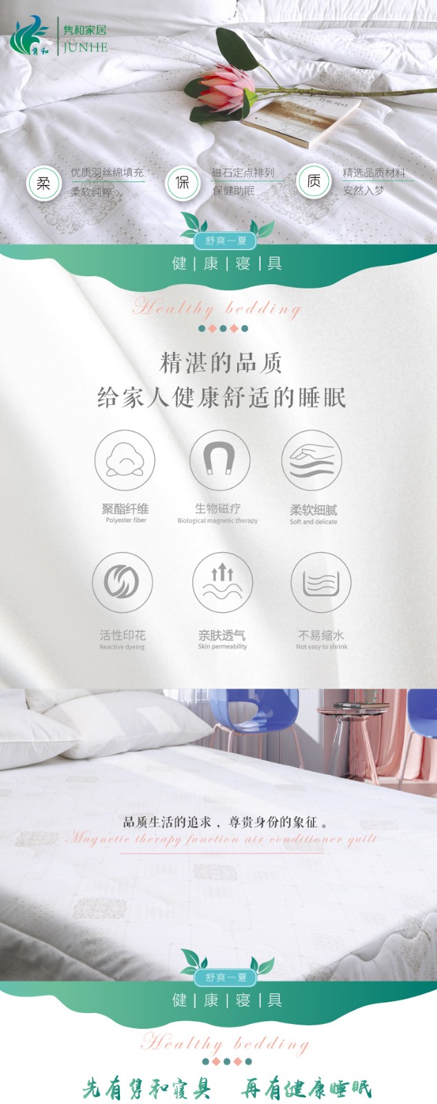 描述:面料采用健康的活性环保印染工艺,亲肤透气,水洗不易缩水 内部填充生物磁石,采用纳米科技,还能达到抗菌防螨的作用 只需睡眠一整夜,为你扫除疲惫,精神焕发