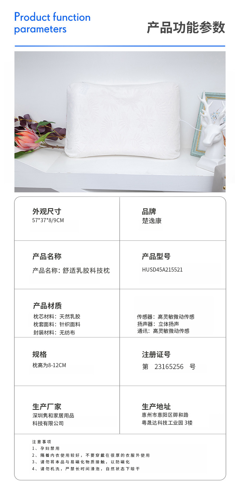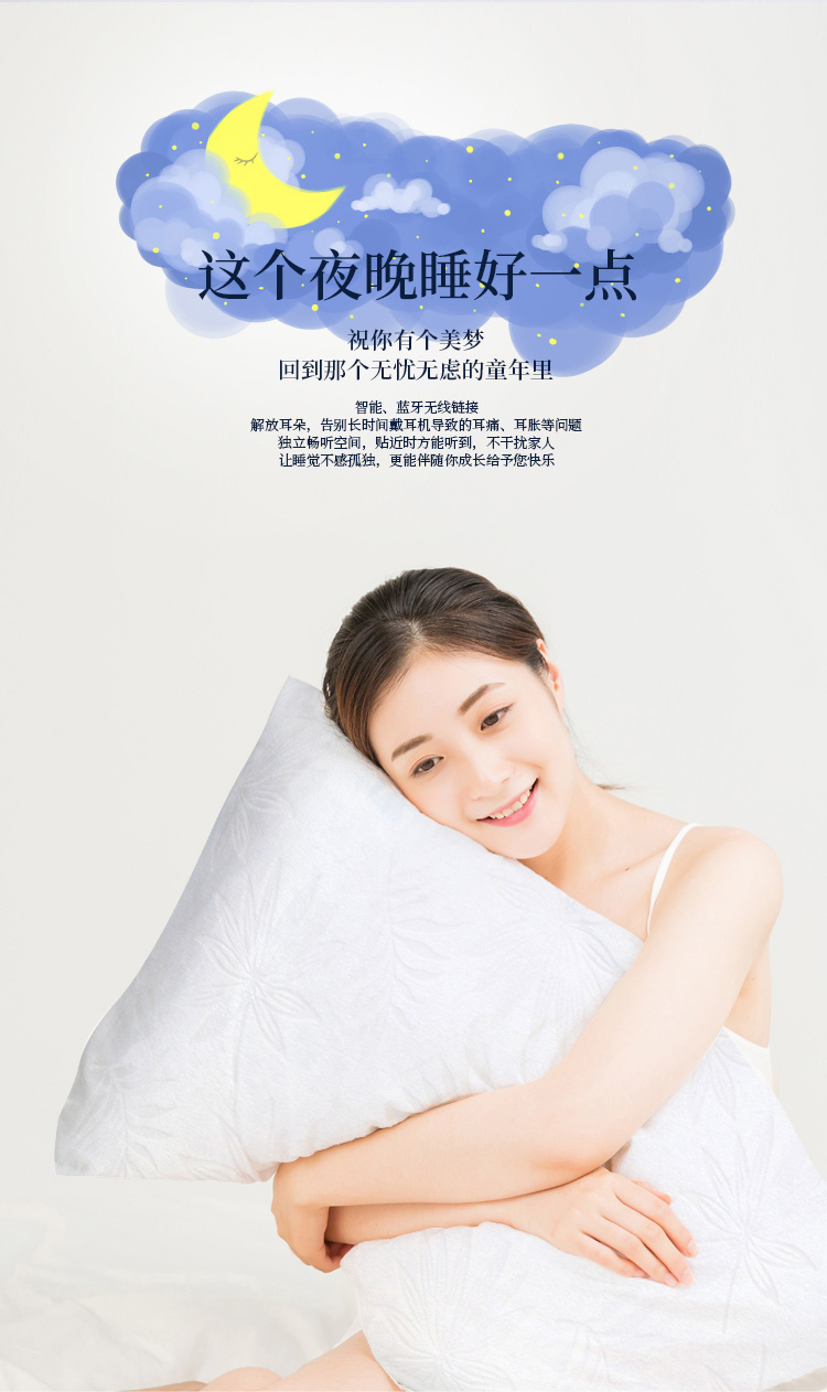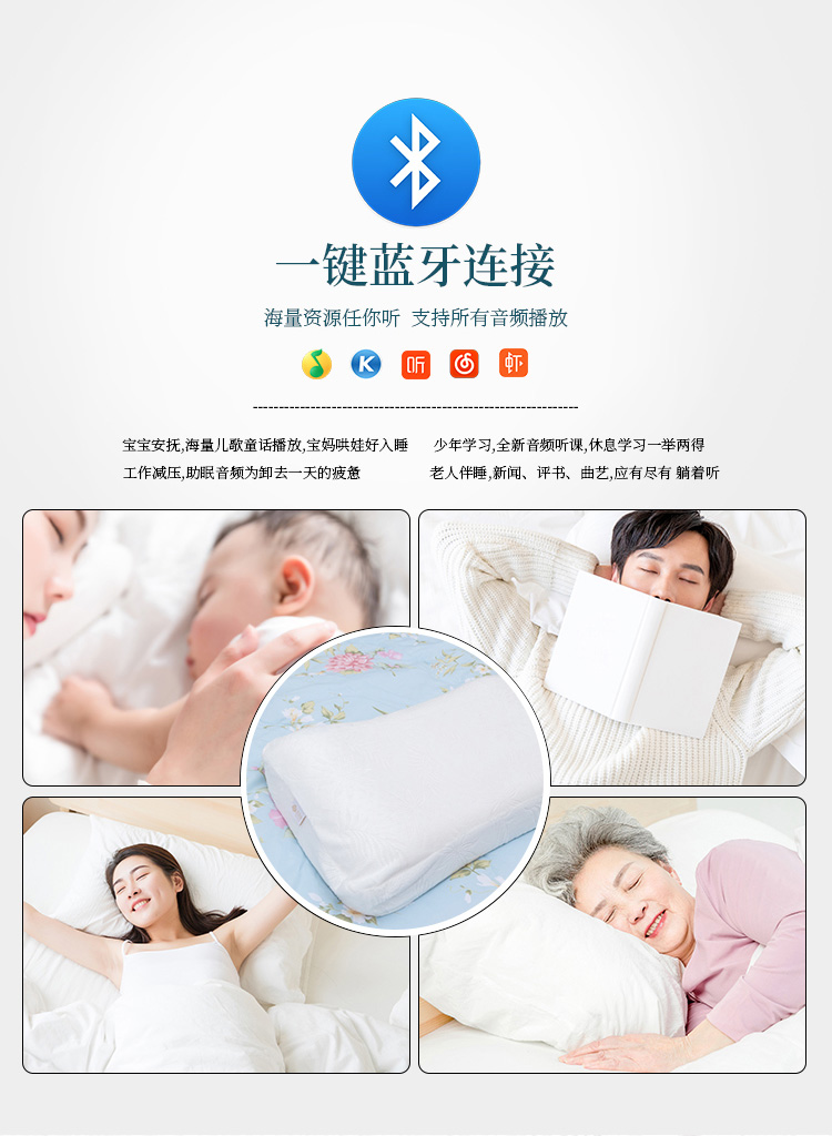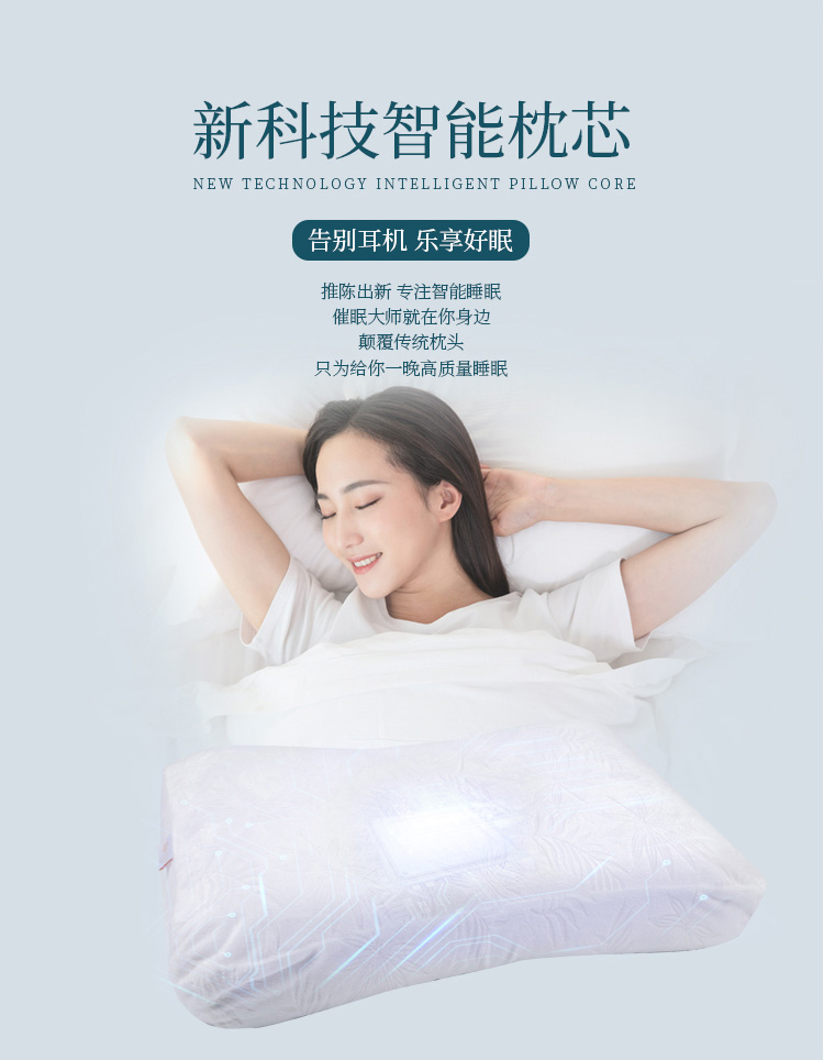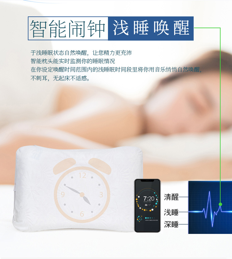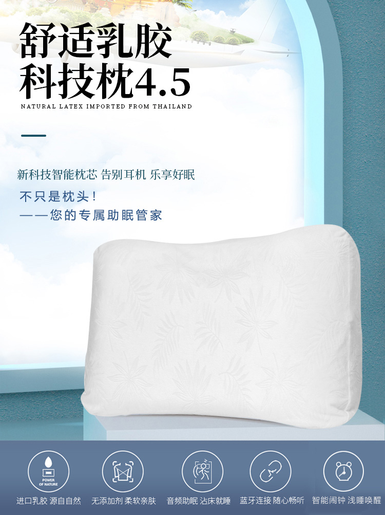 描述:可以听歌的智能枕头,无需佩戴耳机; BBT智能音频助眠;采用泰国进口天然乳胶,舒适透气;还有监控睡眠和设置闹钟等功能