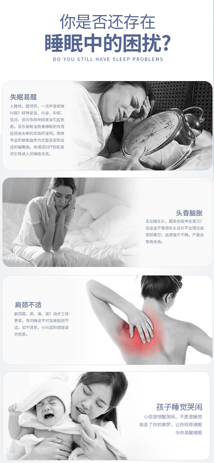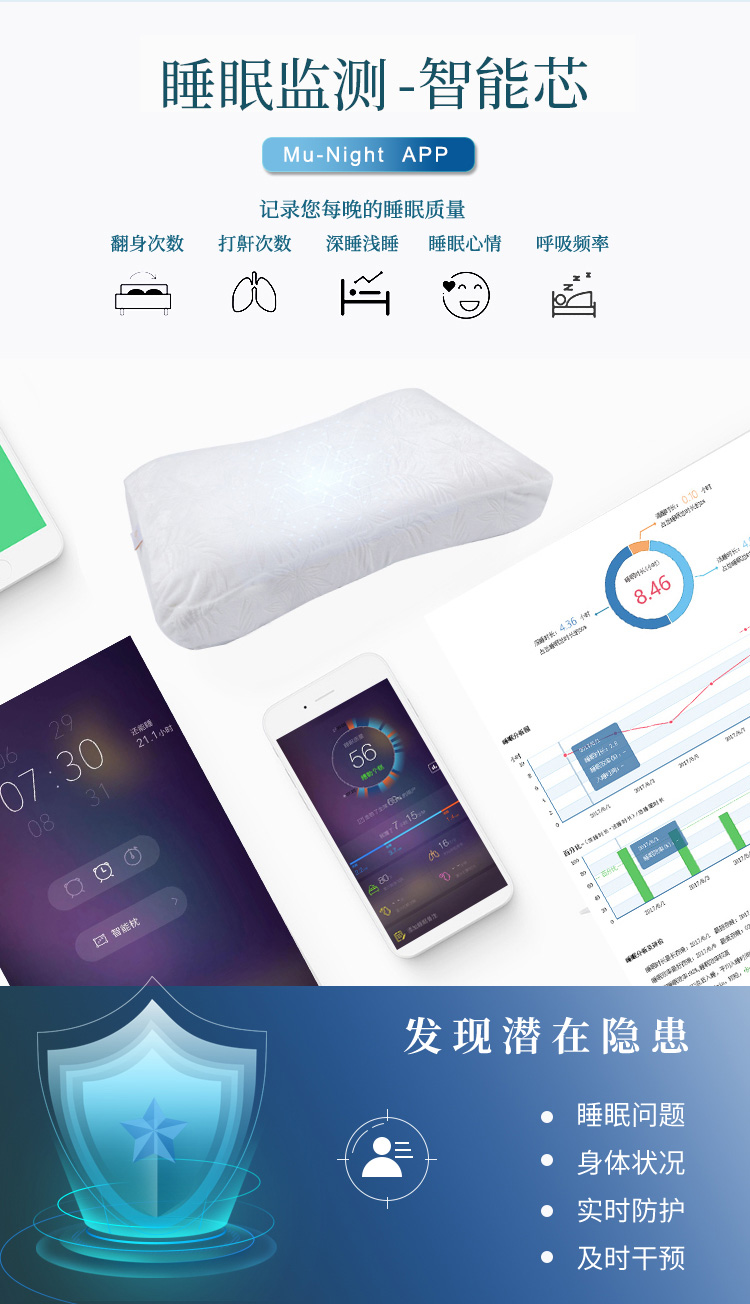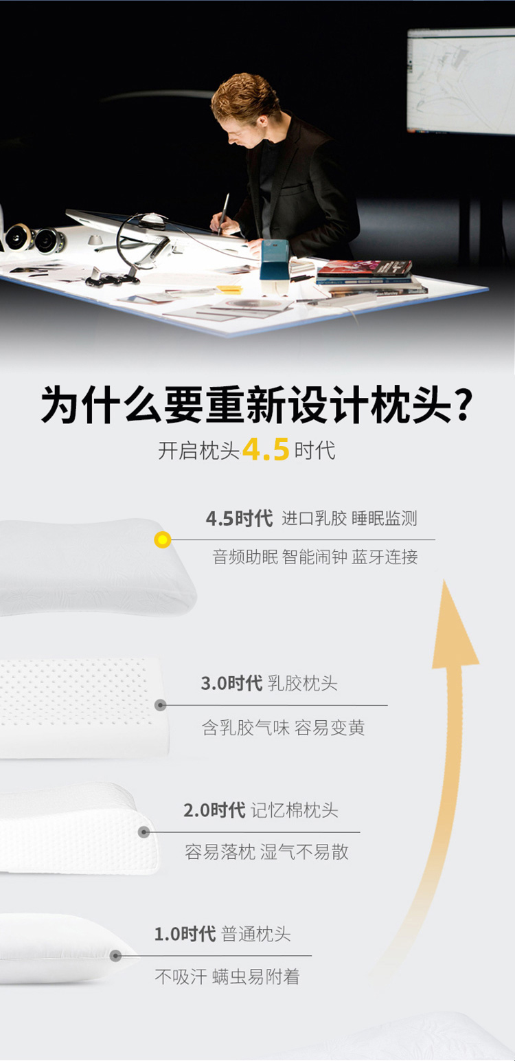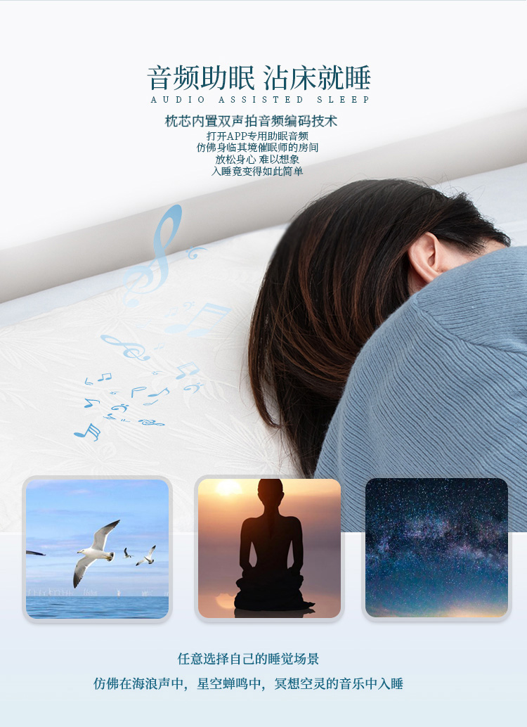 描述:可以听歌的智能枕头,无需佩戴耳机; BBT智能音频助眠;采用泰国进口天然乳胶,舒适透气;还有监控睡眠和设置闹钟等功能