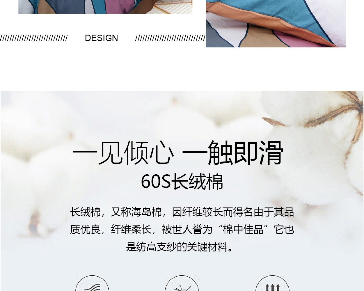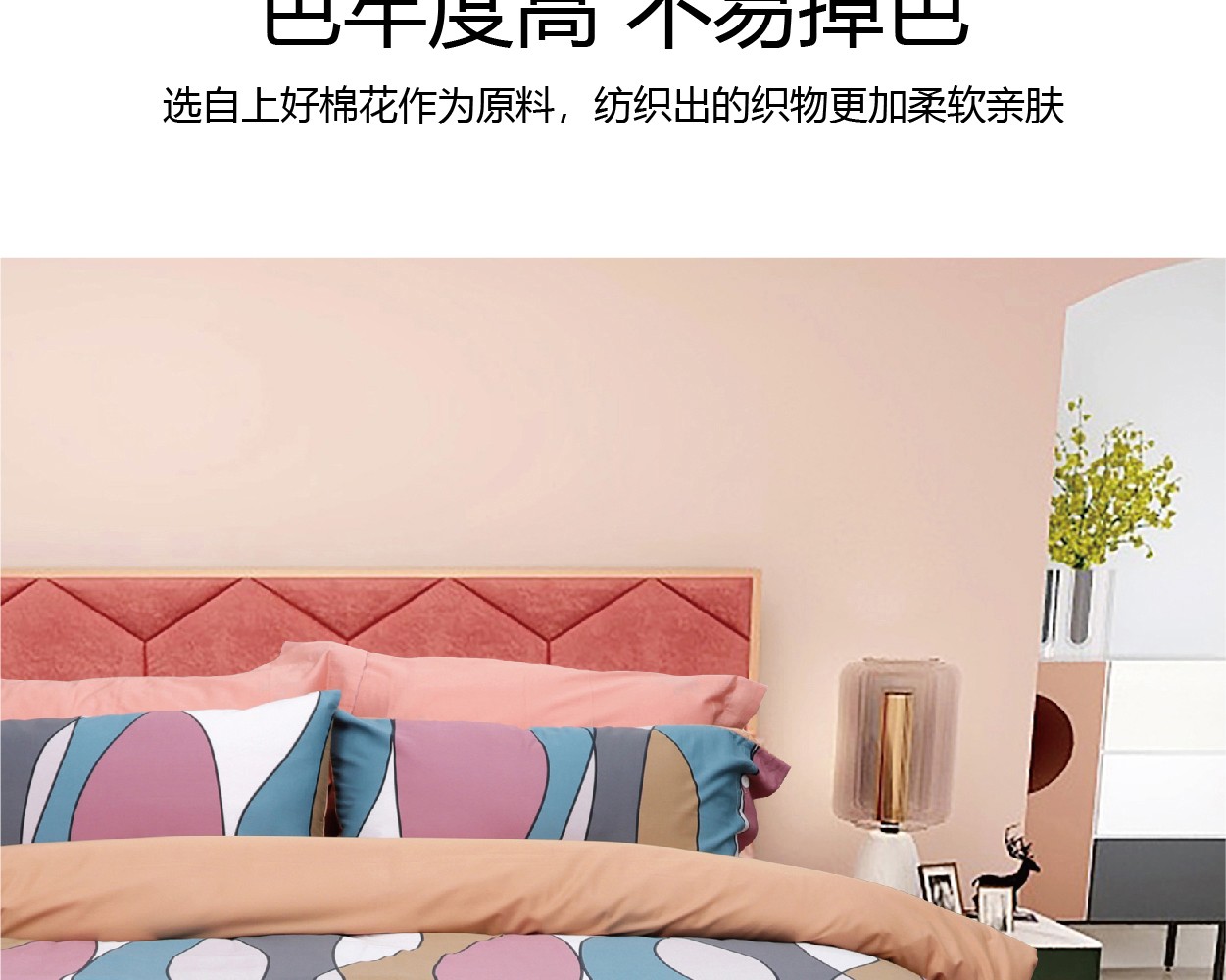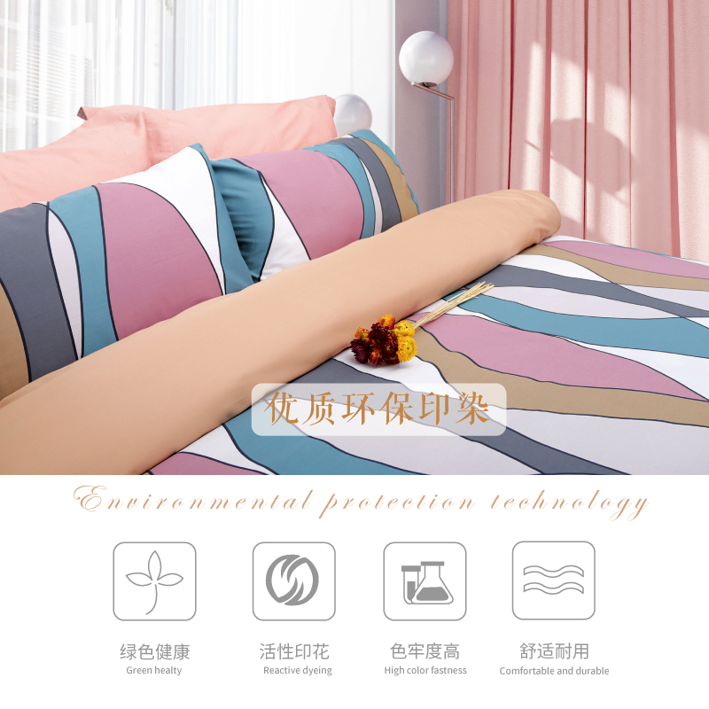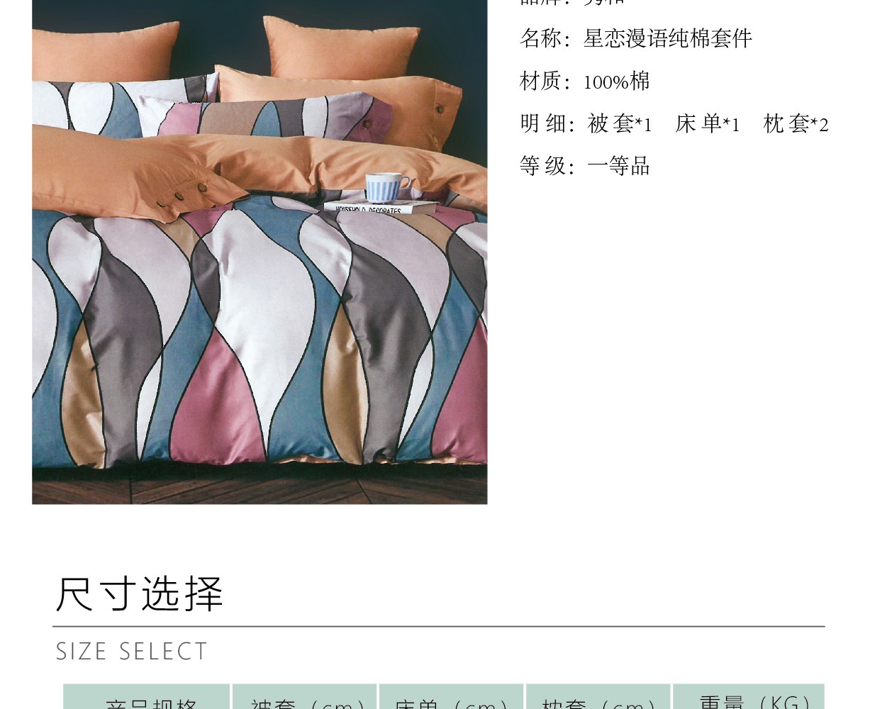 描述:100%纯棉面料,精选长绒棉,环保活性印花工艺,健康环保 全工序纯棉精织,柔软舒适,吸湿透气,带给您舒适的睡眠体验。