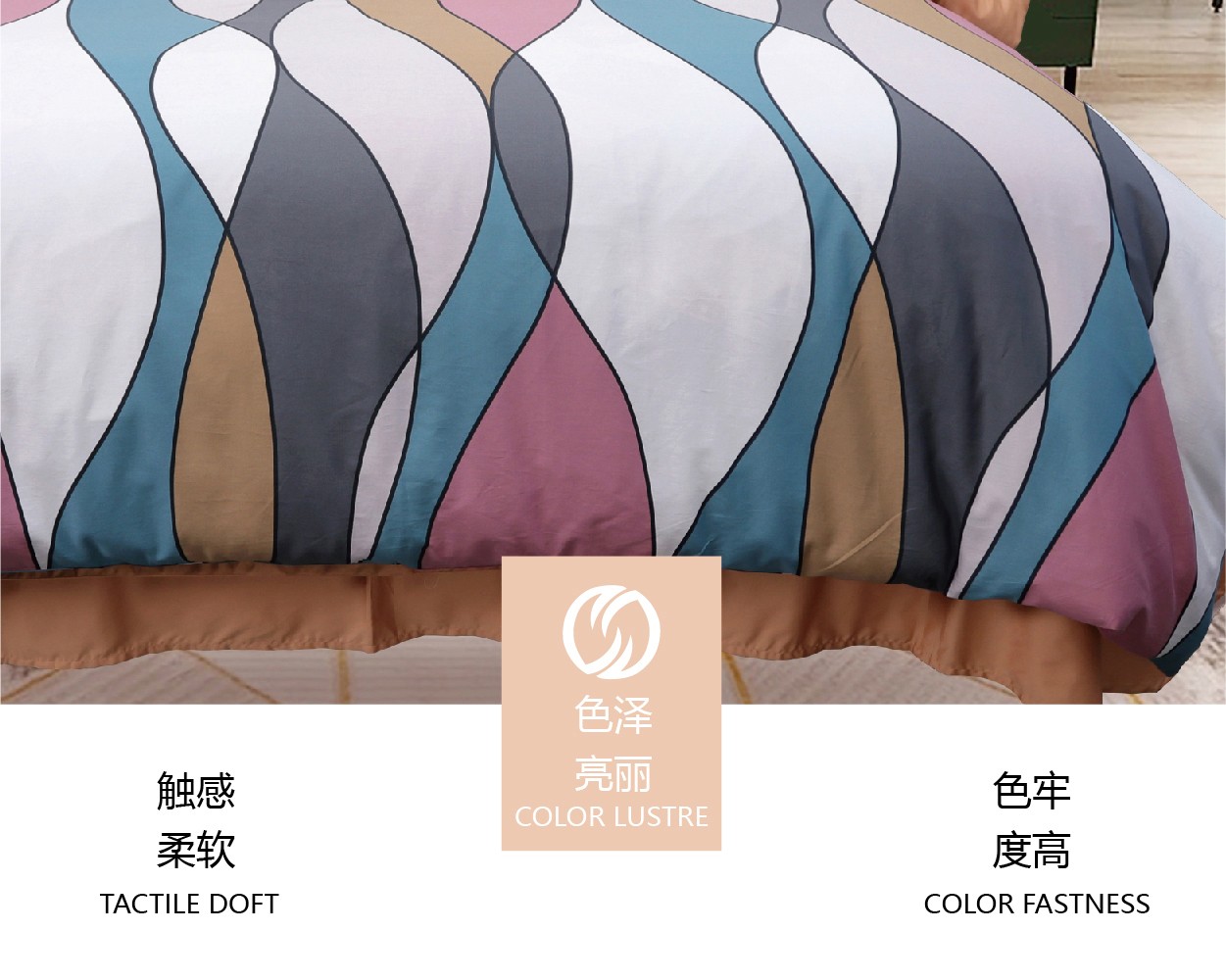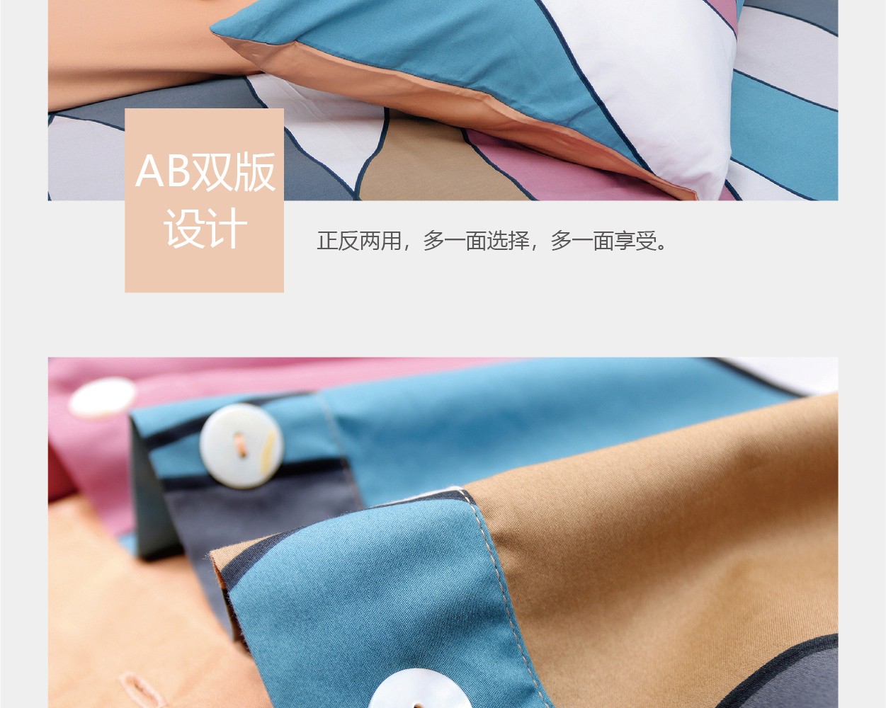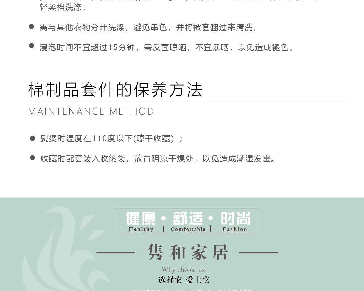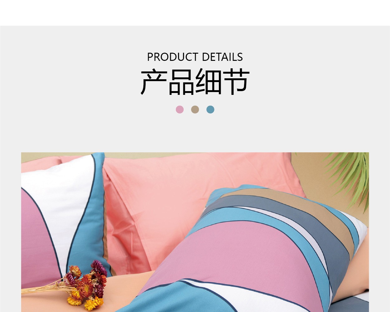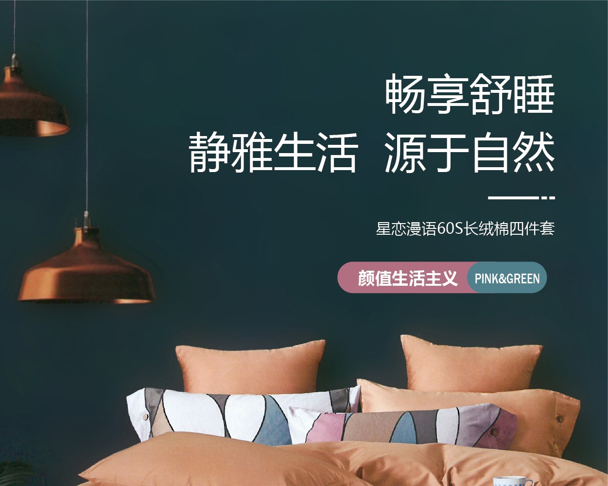 描述:100%纯棉面料,精选长绒棉,环保活性印花工艺,健康环保 全工序纯棉精织,柔软舒适,吸湿透气,带给您舒适的睡眠体验。
