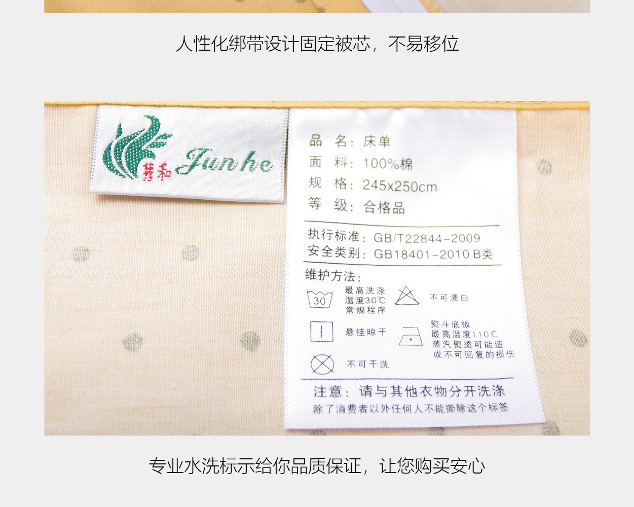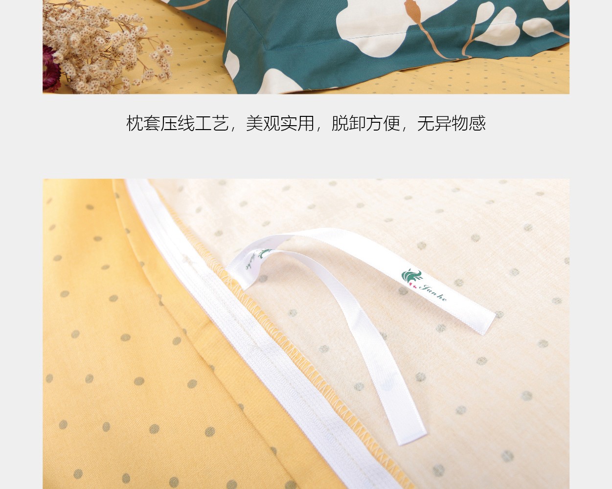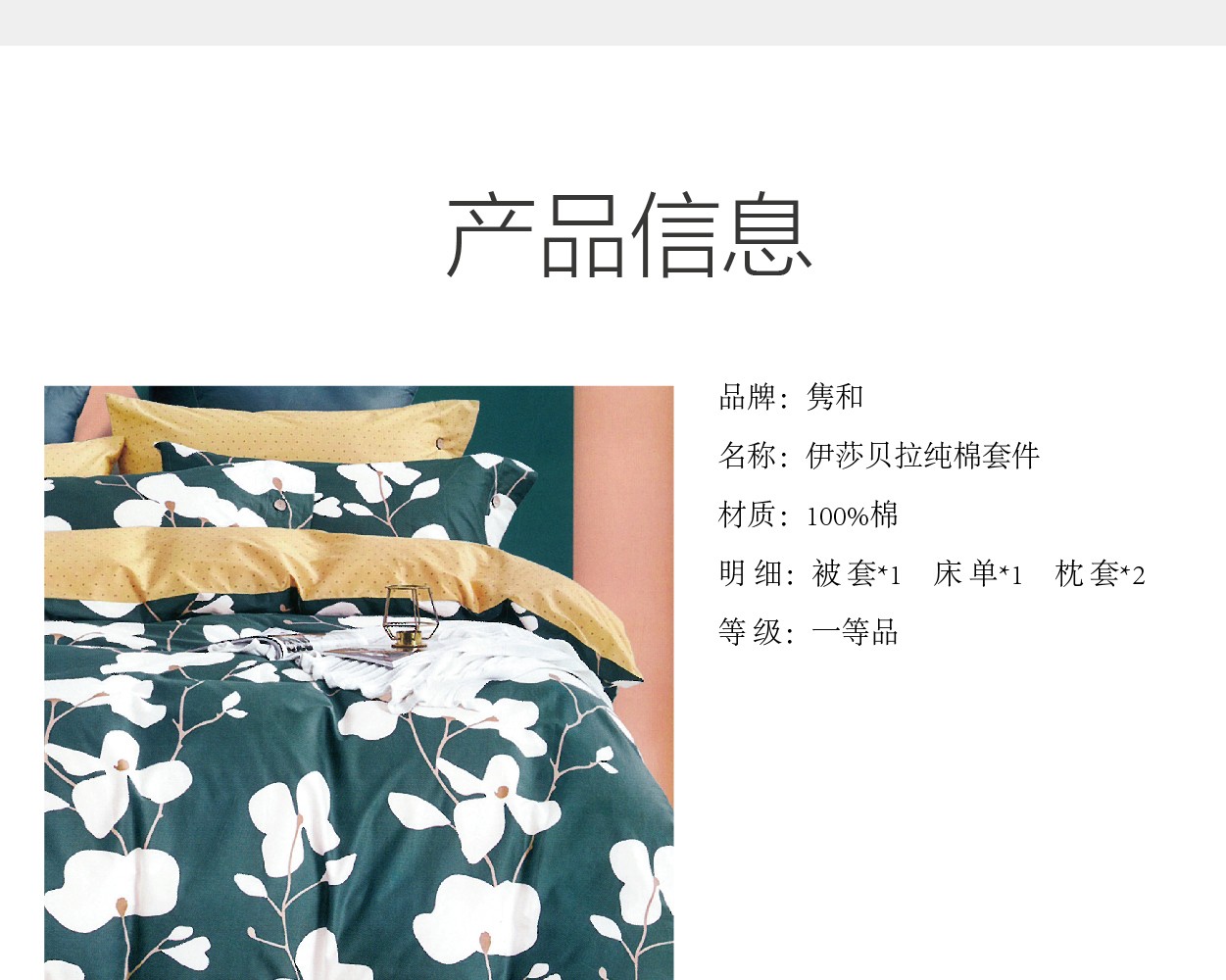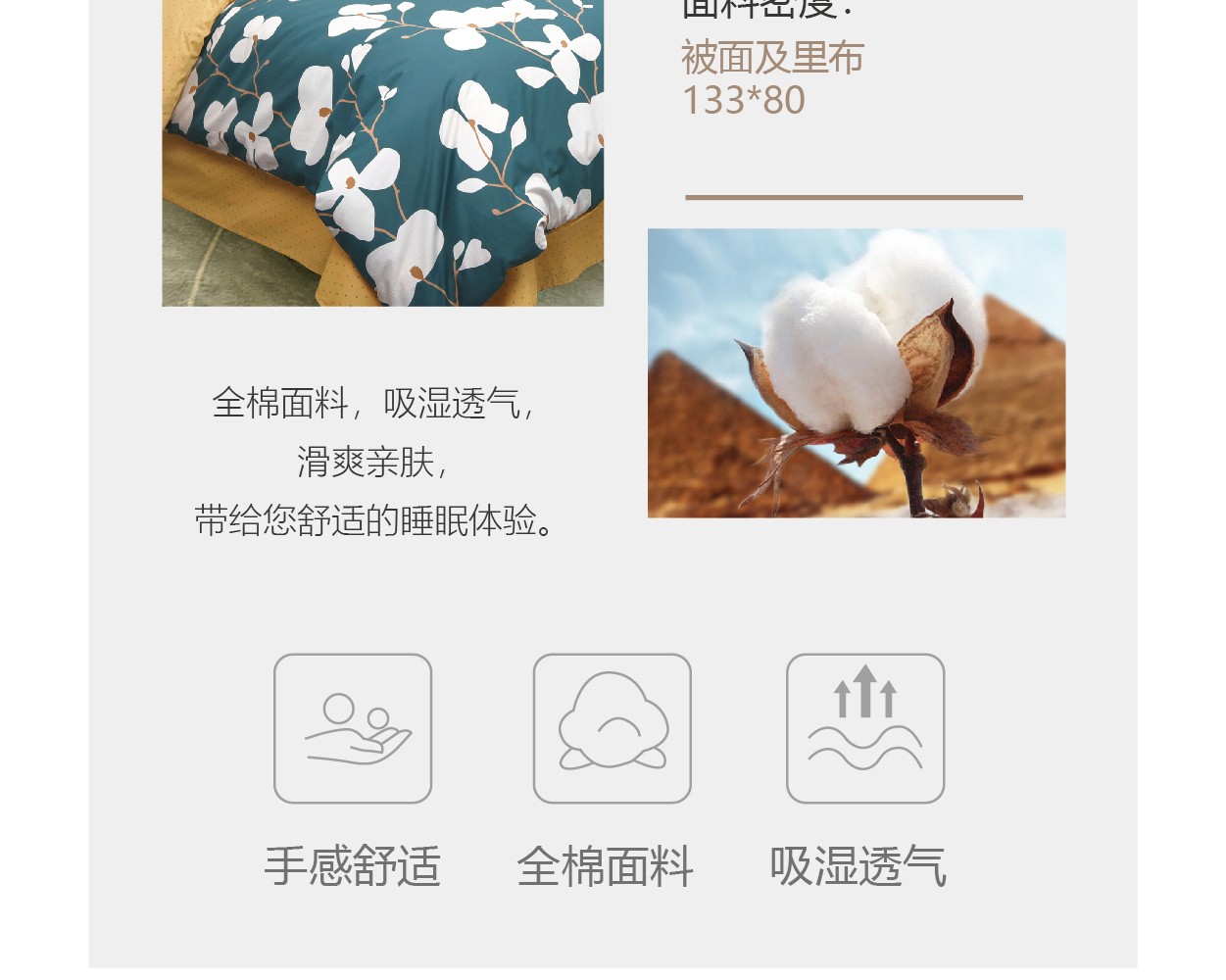 描述:100%纯棉面料,优质环保印染工艺,无任何甲醛、增白剂、安全环保健康 全工序纯棉精织,柔软舒适,吸湿透气,带给您舒适的睡眠体验。