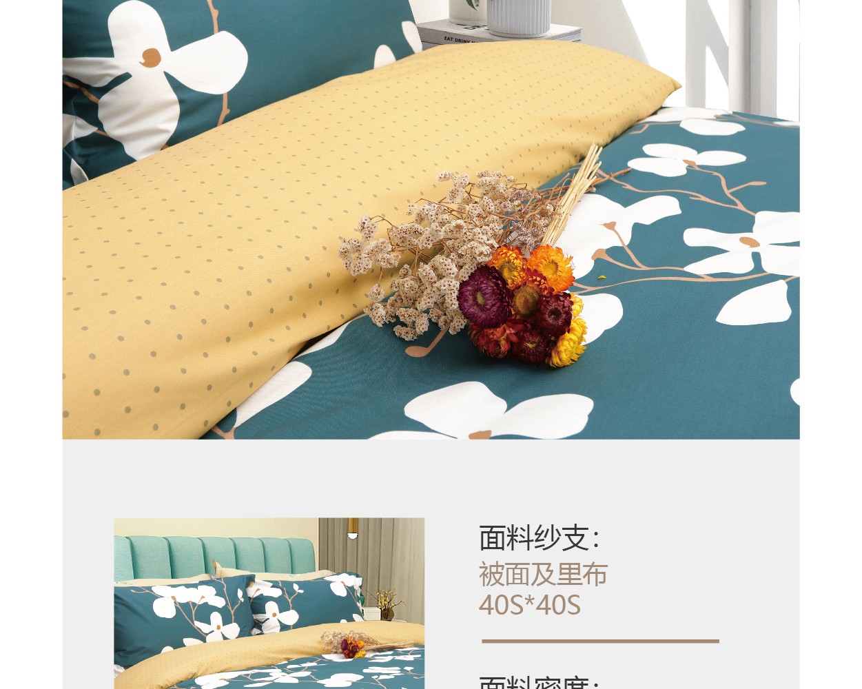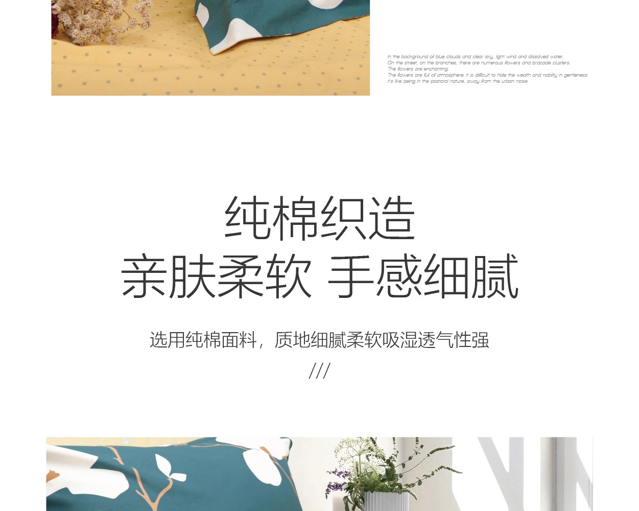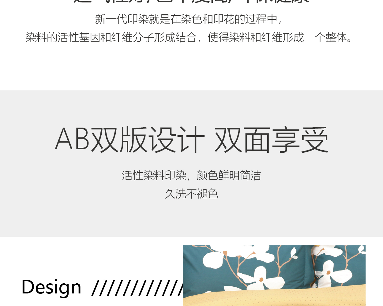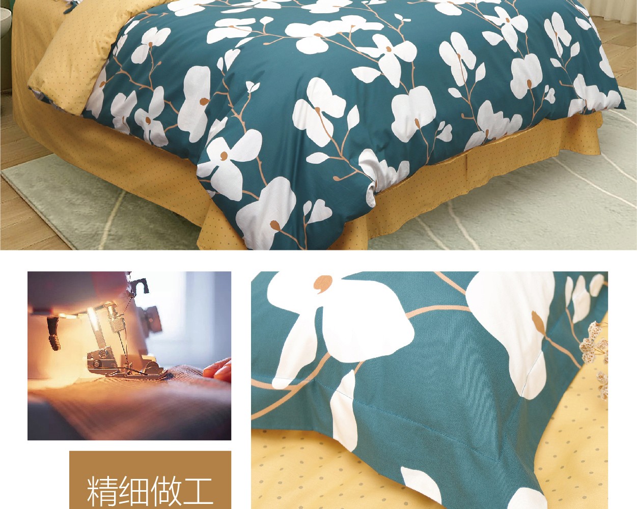 描述:100%纯棉面料,优质环保印染工艺,无任何甲醛、增白剂、安全环保健康 全工序纯棉精织,柔软舒适,吸湿透气,带给您舒适的睡眠体验。