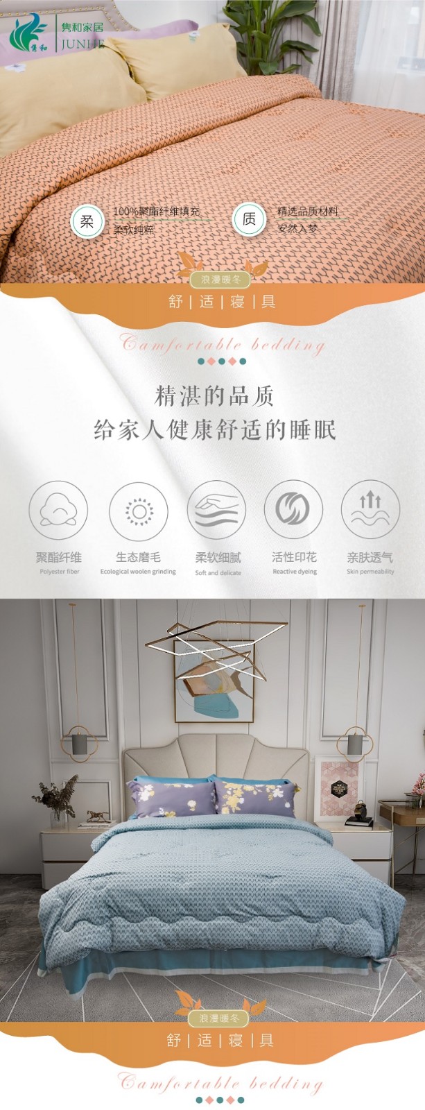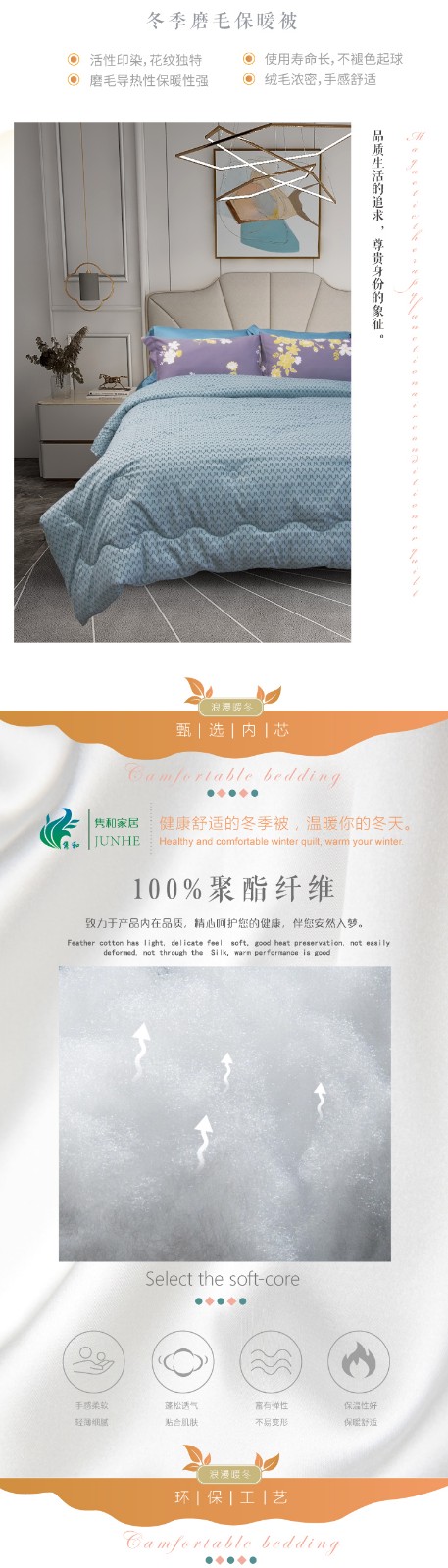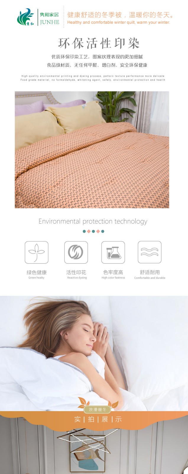 描述:100%聚酯纤维棉,大方设计,时尚两色任选 优质环保印染工艺,无任何甲醉,增白剂,更健康,跟保暖,更实惠