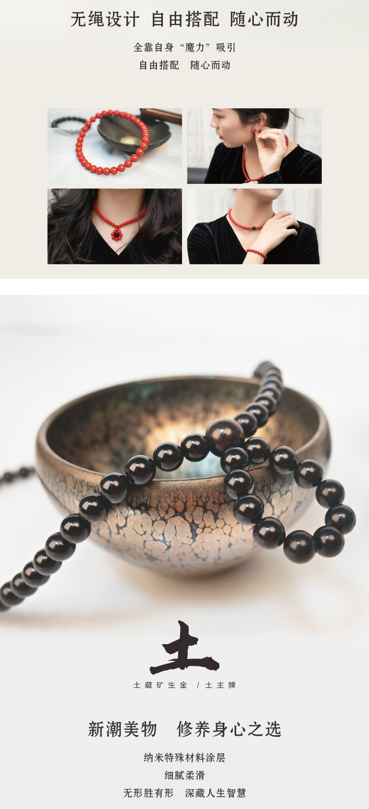 描述:采用珍贵稀土磁石,产生类磁灸效应,呵护健康,对应五行的无绳时尚设计,5种颜色任意选则,且可以随意组合各种形状