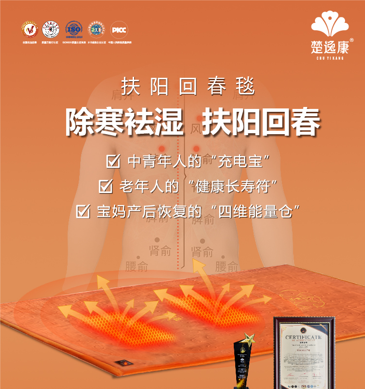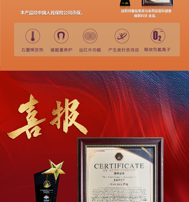 描述:楚逸康扶阳回春毯是一款具备石墨烯发热及磁石理疗等多重功能为一体的功能垫子,对于女性月子、痛经,瑜伽保健等有很好的帮助作用,同时此产品在2025年马来西亚获得国际健康睡眠科技金奖。
